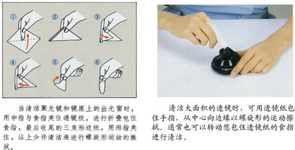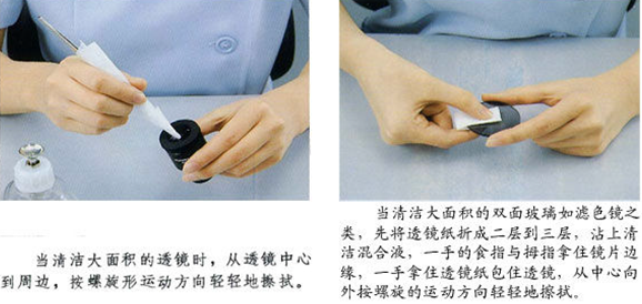 ??? 最好先用吹氣球或者吹氣槍先吹掉表面大的塵土顆粒,結合軟毛刷輕輕吹刷,因為這些顆粒往往容易劃傷鍍膜層,然后再用擦鏡紙醮取清潔液進行擦拭??蓞⒖既缦聢D例所示方法: