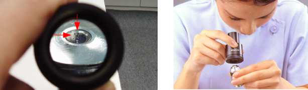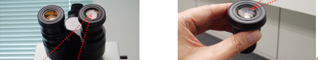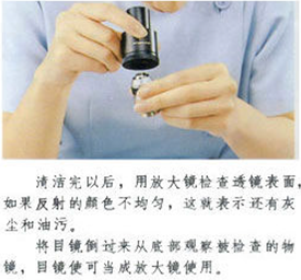 如上圖,我們逆著光的方向,可以清楚的看到物鏡表面的臟物并清除。如右圖,改變觀察角度可以清晰判斷目鏡表面臟物并清除。