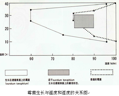 ??? 顯微鏡的光學表面都有防霉系統,各個廠家都是采用化學藥品鍍膜防霉,一般有效期大約在7-8 年左右,超過8 年以后,防霉系統會失效,此時,應該找顯微鏡廠家重新安置防霉片,否則,實驗室條件差的顯微鏡會開始長霉,南方潮濕地區特別顯著,霉菌會分泌有害物質腐蝕玻璃表層的鍍膜層,霉菌密度大時危害特別大,這樣會嚴重危害顯微鏡的光學性能,因為鍍膜層是光學顯微鏡性能的關鍵所在。上圖是霉菌生長與溫度和濕度的關系圖(僅供參考)。