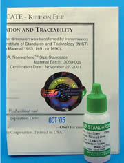 納米級微球顆粒標(biāo)準(zhǔn)品(Particle-Size Standards)直徑大小高度均一,具有NBS 的NIST認(rèn)證,屬于Duke Scientific公司榮譽出品Nanosphere Size Standards™系列產(chǎn)品中的聚合體微球標(biāo)準(zhǔn)品(苯乙烯單體聚合而成)。