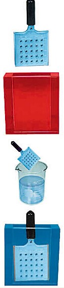 套裝包含:一個25孔彈性塑料染色板(the matrix with handle),一個染色板蓋子(cover),2個染色缸(staining vessel)。