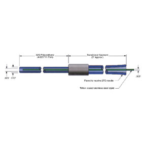該導管系統提供最小直徑導管 /管芯產品,適用于小鼠和其它小型研究動物的心血管、顱內實驗應用。32G小鼠顱內導管構造圖見下,前端也是主要部分長11.7cm,尺寸32G 的聚氨酯導管(0.010英寸O.D./ 0.005英寸 I.D.);緊接著后段是過渡連接區域長大約7.6cm,其末端膨大為喇叭形連接口(可配套27 G 針);整個導管內有一條直徑 0.003英寸 的特氟龍材料包被的不銹鋼針(鈍頭針)。該導管系統獨立包裝。