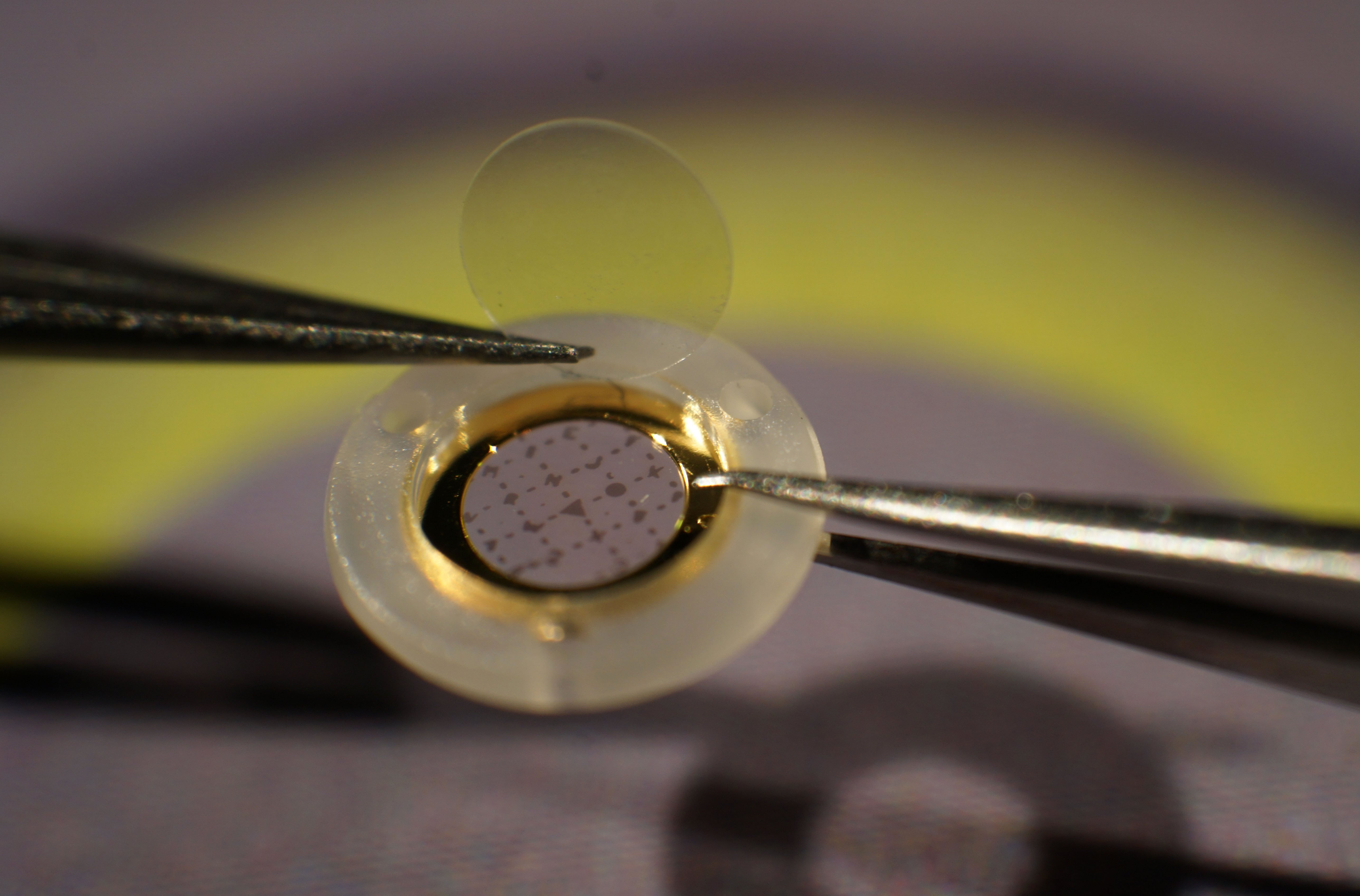 這是專(zhuān)門(mén)為萊卡高壓冷凍儀HPM100設(shè)計(jì)的一款樣本準(zhǔn)備工具,整體類(lèi)似一個(gè)小型培養(yǎng)皿。首先在藍(lán)寶石圓片(載物作用)上置一個(gè)50微米厚度的黃金圓環(huán),外夾環(huán)形塑料片,具體的樣子見(jiàn)下圖。樣本置于載物作用的藍(lán)寶石圓片上,再覆一個(gè)蓋片,蓋片也是藍(lán)寶石圓片,可以簡(jiǎn)單地把樣本封在兩個(gè)藍(lán)寶石圓片之間,樣本艙置于一個(gè)特殊的特殊的適配器內(nèi)(HPM100,HPM010,HPF COMPACT O2儀器均有這樣的適配器)。活細(xì)胞之類(lèi)的樣本在進(jìn)入高壓冷凍儀之前在這個(gè)樣本艙內(nèi)可以直接在光鏡下觀察呈像。從高壓冷凍儀內(nèi)出來(lái),進(jìn)一步進(jìn)行冷凍替代和常溫切片。