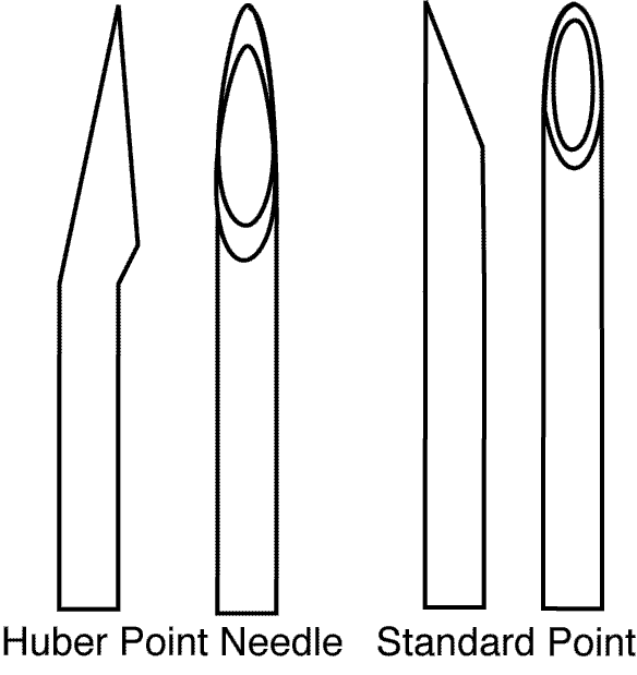 提倡用此針配套植入式輸液港或者肝素帽使用,可以大大延長植入式輸液港或肝素帽的壽命。普通注射針和Huber注射針對植入式輸液港的隔膜進行了穿刺落屑比對試驗,結果表明,采用Huber注射針穿刺后的落屑數均明顯少于普通注射針的試驗結果(huber注射針又稱不落屑針)。這是因為Huber注射針的針尖采用了獨特的幾何形狀,防止或者減少了取芯作用(針頭穿過材料時一部分進入到針尖附近腔中的現象)。